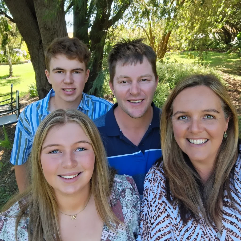 We have two properties in South Australia: “Noojee” at Reedy Creek, where Mark’s brother David lives, and “Binnowie” near Greenways, where Mark and I (Melissa) live. Mark’s parents are also still a part of the business but reside off the farm. The two properties total 1,700 acres, with an additional 600 acres leased next door to “Binnowie”. We have 3,000 self-replacing breeding ewes, 124 cattle for trading at present with plans in the future to keep trading cattle, reducing some sheep numbers and finding some more balance to suit the lifestyle. We plant forage barley and other crops for our own seed and sheep feed. We also sow our own pasture for hay crops; selling excess when available. Additionally, Mark and I also operate Beggs Farmstay B&B, which has been running since 2014, and a mobile coffee van business, Beggs Bean and Bar, which started in 2022, involving our teenagers in the business too.
